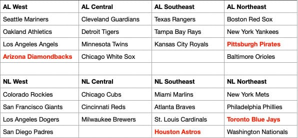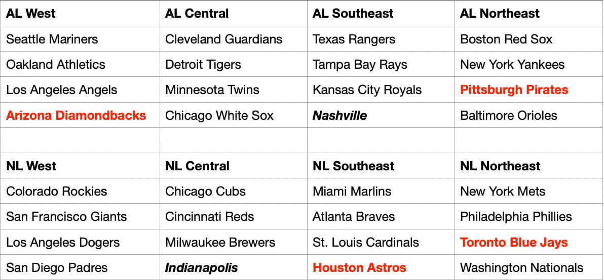 Okay, with all of that done, let's assign them into some leagues! We can mostly keep things the same (AL/NL teams stay in their league), but there are a few changes that will really clean this up. See below (changes in red)