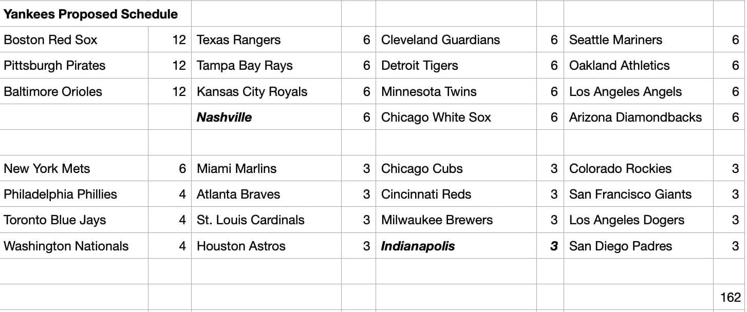 I made up a proposed schedule, using the Yankees as an example (though it should work fine as a template for all teams)